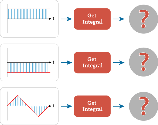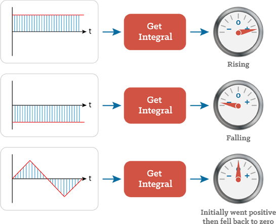 So let’s go back to our black boxes to check our intuitive understanding. This time we have boxes that take the input signal, calculate the integral, and output the value to a centre-zero meter.