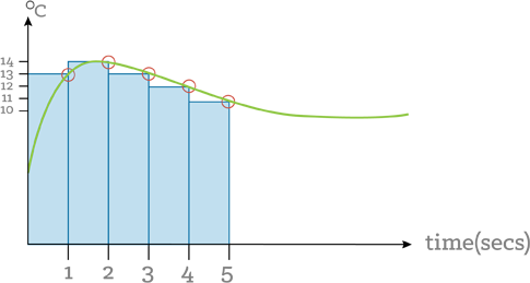 The green line is your temperature, the red circles are where your control system has sampled the temperature and the blue area is the integral of the temperature signal. It is the sum of the 5 temperature values over the time period that you are interested in. In numerical terms it is the sum of the areas of each of the blue rectangles: